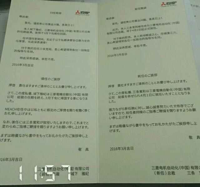 三菱電機(jī)自動(dòng)化(中國(guó))有限公司原總裁城下雅紀(jì)任期到2016年3月31日滿(mǎn),4月1日起新任總裁三條寬和上任