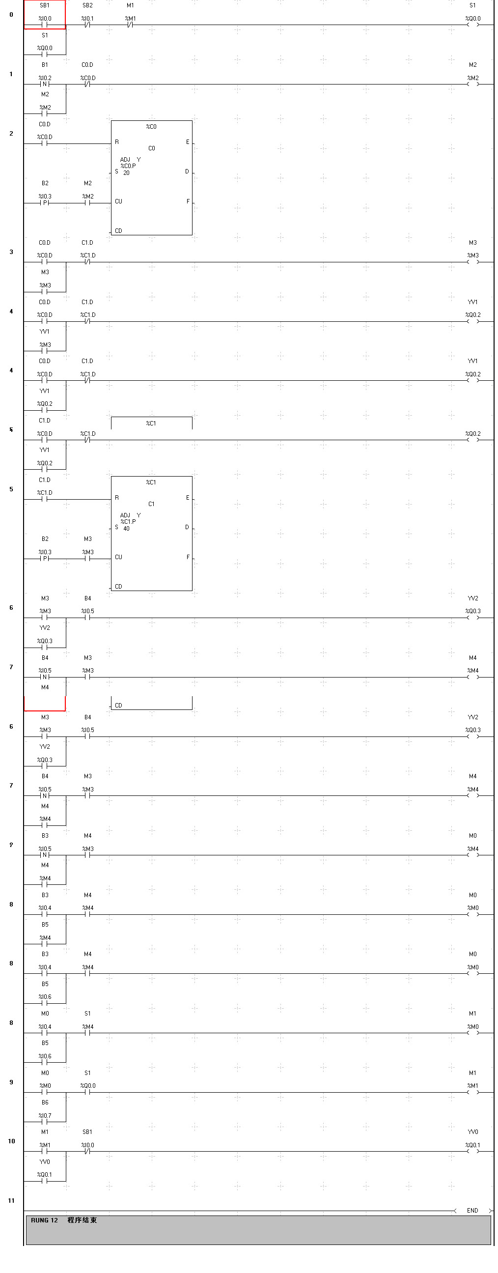 在I0.5的有信號,且離合器吸合時,Q0.3電磁閥吸合(配件給料),直到I0.5信號終止電磁閥釋放,電磁離合器吸合40個脈沖后,停止輸出!