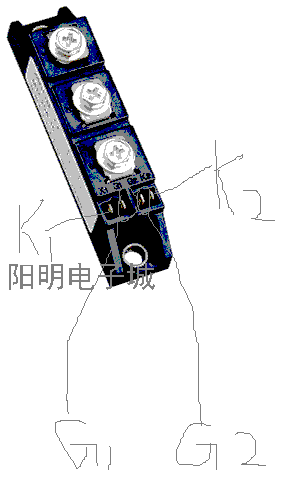 這是一個(gè)由兩個(gè)單向大功率可控硅并聯(lián)的模塊,K1、K2是和輸出端直通的,G1、G2分別是兩個(gè)可控硅的控制極,變頻器的主電源回路部分用的較多,主要作用是防止變頻器上點(diǎn)瞬間過電流引起空開跳閘,有些變頻器是用接觸器代替這一部份。