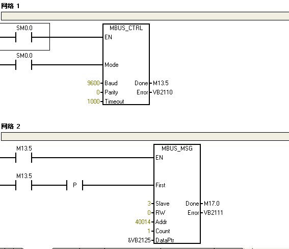 西門子224XPsi,三菱變頻器A740.通過內置RS485端子通訊,現在有三臺變頻器,我現在只連一臺變頻器都連不上,報Modbus忙于處理另一個請求:一次只能激活一條MBUS_MSG指令,但是我把變頻器的通訊線拔了它還是報這個,所以我想是變頻器的參數問題了pr331=3,332=96,333=1,334=0,綜合來講就是變頻器站號為3,波特率9600,2位停止位,8位數據位,無奇偶校驗。pr550=1,pr551=0,pr79=2,就是連不上     至于硬件接線   RXD1+      TXD+       P0口 3腳   三個接一起;RXD1-    TXD-    P0口8腳接一起