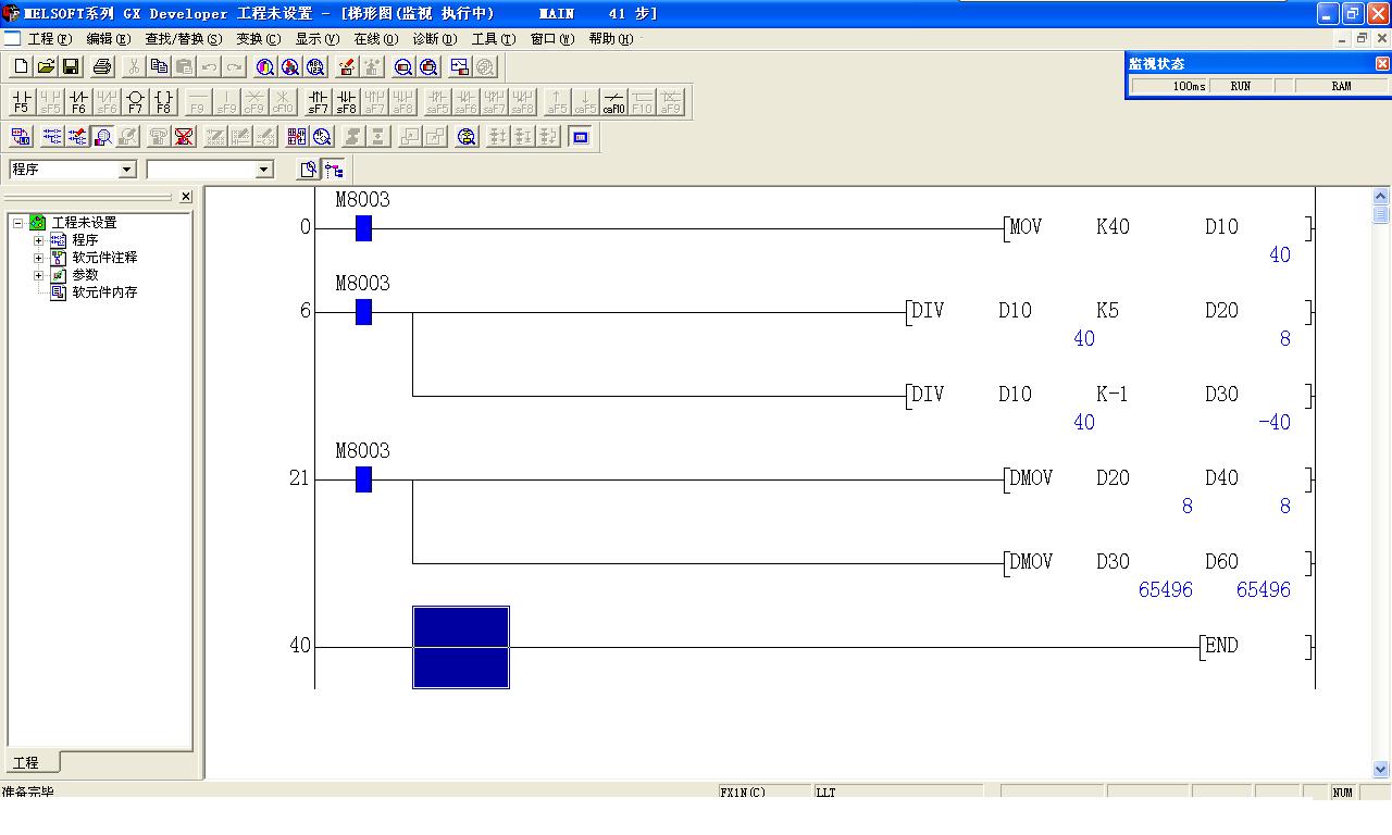 根據(jù)FX1N手冊 [DIV D2 D1 D10]等于D2/D1,得出的數(shù)據(jù)存入[D10 D11]中,存入結果為32位。