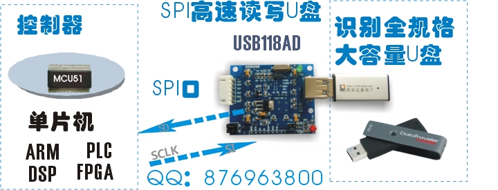 采用西安達泰電子設(shè)計的U盤讀寫模塊可以避開復(fù)雜的USB協(xié)議,通過標(biāo)準(zhǔn)串口或者高速SPI口,非常簡單快速地實現(xiàn)儀器設(shè)備的海量存儲。該模塊已經(jīng)經(jīng)過5年市場運行,使用簡單,性能可靠,產(chǎn)品由最初的USB118A升級為USB118AD。
