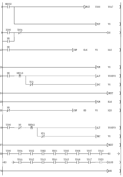 好像不行,V0到了16停止不了,我做了一些修改,我仿真測試的時候看到Y20也一直在交替輸出,為什么?還有就是在啟動的過程中按停止或者在停止的過程中按啟動會有錯誤動作,為什么?那位老大賜教一下,謝謝。(各位老大不要拍我磚頭啊。