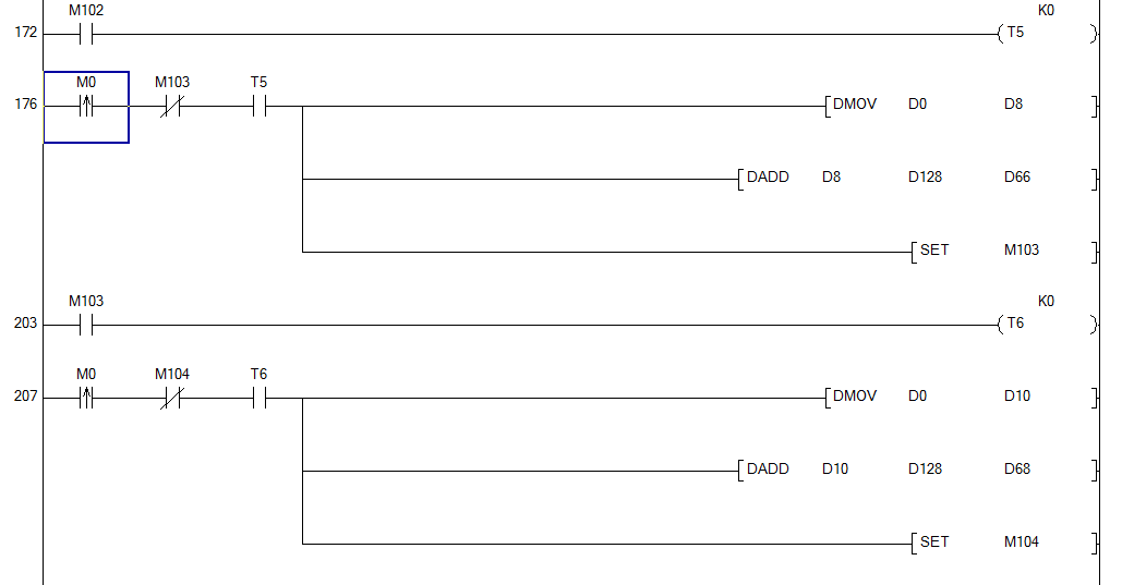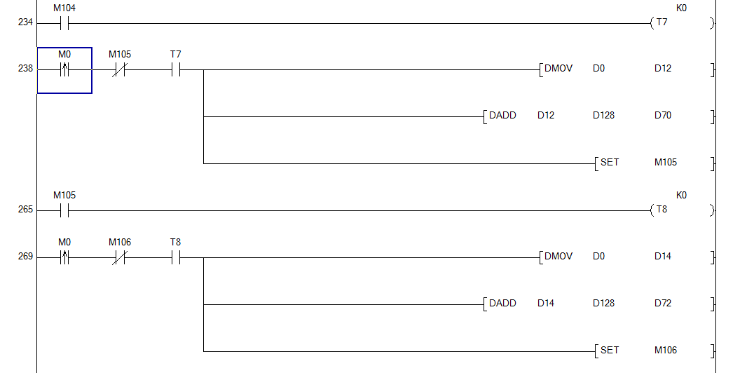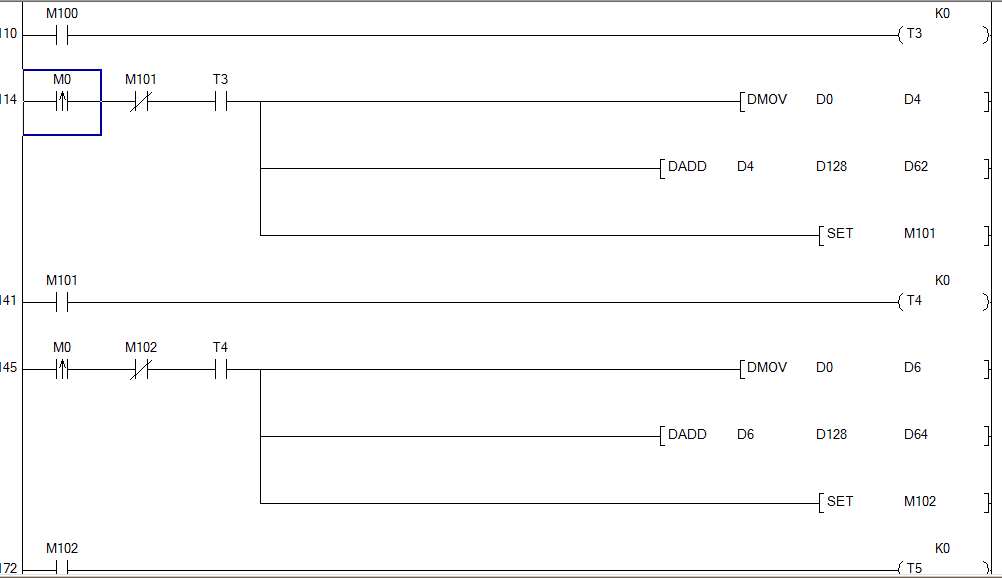 先工藝有兩道工序 ,第二工位受第一工位控制,當(dāng)?shù)谝还の挥挟a(chǎn)品(感應(yīng)器檢測(cè))延遲一定時(shí)間T,到達(dá)第二工位,第二道工序動(dòng)作;目前編寫的程序可以實(shí)現(xiàn),但是第二工位會(huì)出現(xiàn)遺漏,程序如下,現(xiàn)考慮用SFTR指令 哪位大神有做過(guò)類似的,麻煩給點(diǎn)思路,謝謝!!PLC三菱的