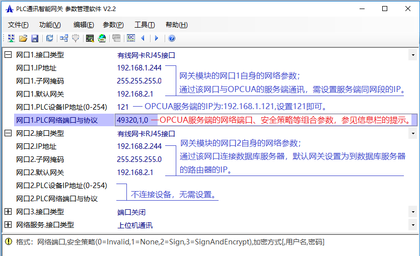 首先,通過網(wǎng)關(guān)的參數(shù)設(shè)置軟件設(shè)置IP地址、OPC服務(wù)端等參數(shù),由‘功能’->‘網(wǎng)口參數(shù)編輯’進(jìn)入如下界面: