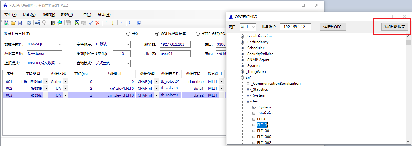 然后通過‘功能’->‘?dāng)?shù)據(jù)上報(bào)與對(duì)接’設(shè)置數(shù)據(jù)庫服務(wù)器的IP地址、端口,用戶名密碼等相關(guān)參數(shù)。通過‘編輯’->‘OPC節(jié)點(diǎn)瀏覽’讓網(wǎng)關(guān)模塊連接上OPC服務(wù)器后瀏覽標(biāo)簽節(jié)點(diǎn),選擇需要上報(bào)到數(shù)據(jù)庫的標(biāo)簽,添加到數(shù)據(jù)配置表,如下圖: