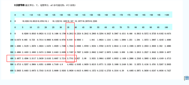 最左側背景(帶顏色)區域,找到400。第三行黛色區域找到35.   垂直對應位置的數值就是435°時,熱電偶輸出電壓。