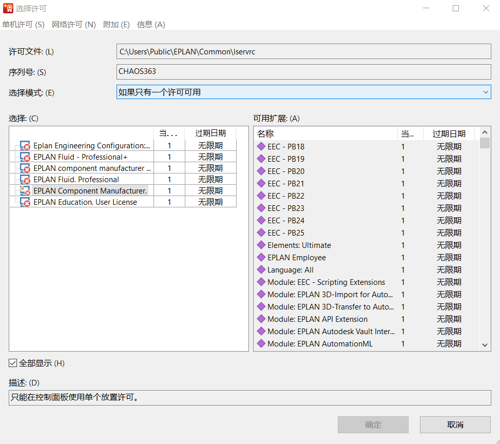 安裝完成激活后可以打開軟件,重啟電腦就出現 選擇許可 窗口,確定按鈕灰色的重新再次激活也是這樣。
