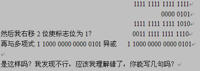 這位大哥,你說的多項式為1 1000 0000 0000 0101嗎?你說的直到Flag位為1怎么說,我算來算去都不正確,如上圖。