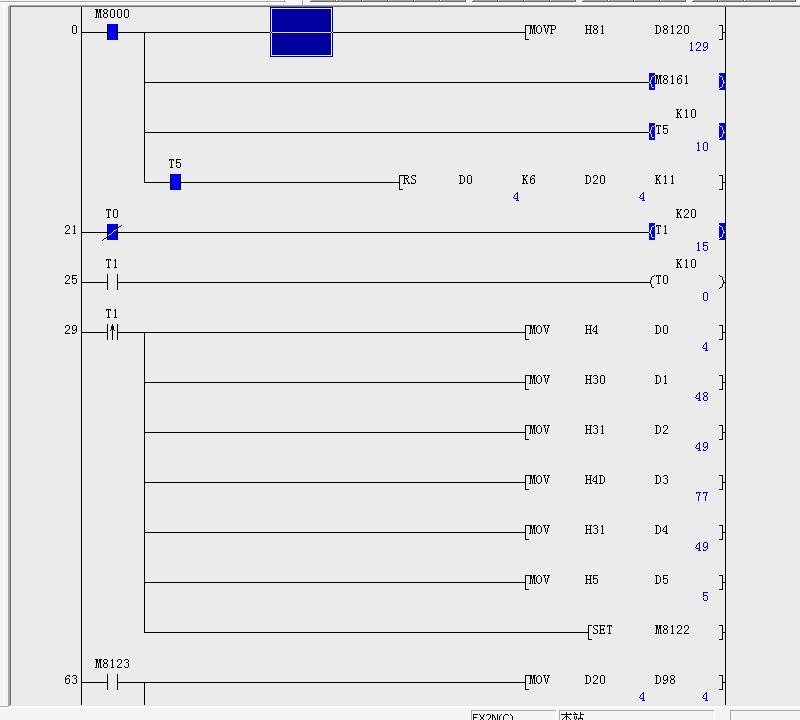 你的程序有問題,你發(fā)送數(shù)據(jù)的RS指令最好把接收的D設為K0,然后讀取數(shù)據(jù)的時候再新建一條RS指令,但是要用時間差來錯開,以免兩條RS指令同時驅(qū)動會不行。