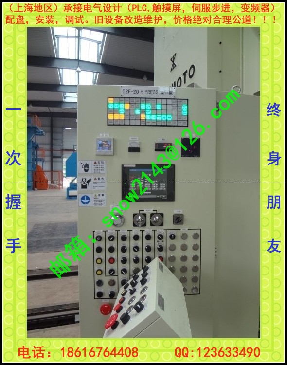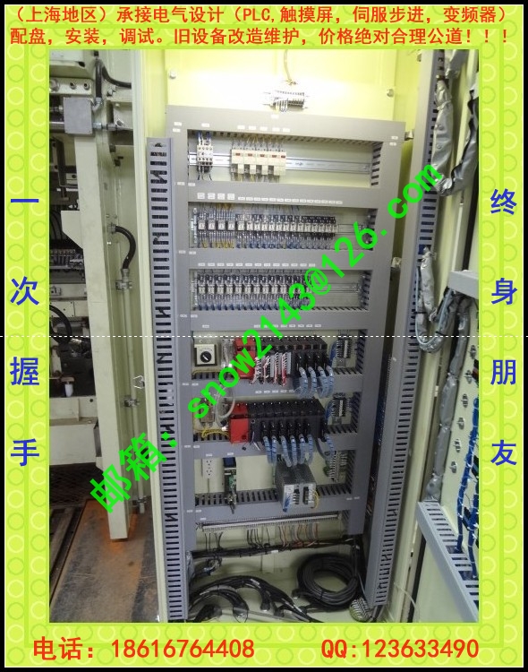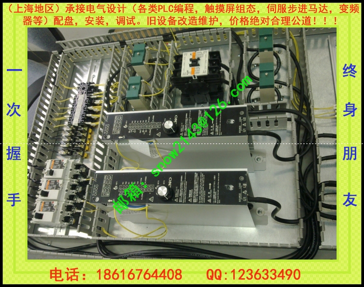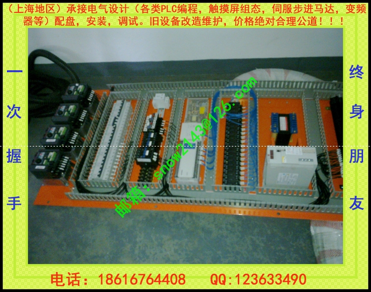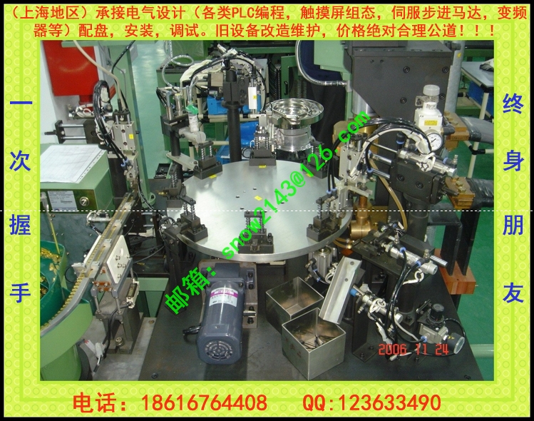 (上海地區)本人有10年多的非標設備設計經驗,主要為汽車制造業和食品包裝業 電子行業,精通三菱,西門子,松下,歐姆龍,臺達 AB 等PLC;以及上位機程序界面開發,運用VB等。三菱,松下 臺達等伺服電機,發那科,ABB,安川等機器人;現承接電氣設計,配盤,安裝,調試。舊設備改造維護,有多人團隊,我做過大量大型項目,歡迎指導,價格絕對合理公道。! 電話:13564070882  陳工