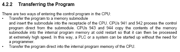 將程序傳至存儲卡再通過存儲卡傳輸,和直接傳至PLC。如果使用存儲卡的話,941和942CPU會執行存儲卡中的程序,943和944CPU則是先存儲卡里的程序復制到PLC內部存儲器再執行。