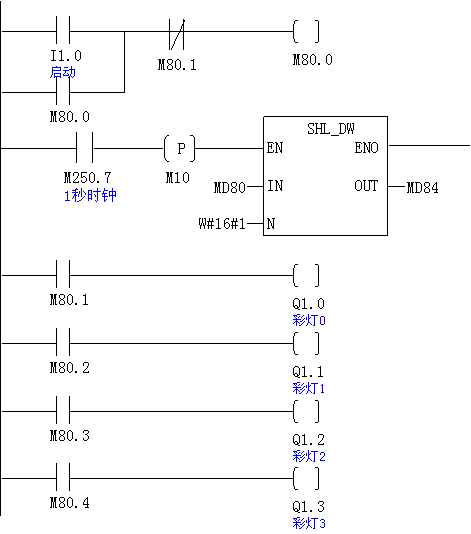 在此基礎上將網絡1的M80.0改為M83.0 。彩燈的輸出點用MD80中的位對應控制。
