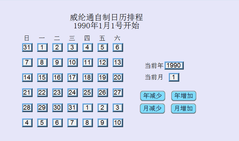 具體思路,1先計算你想要的日期距離1990年1月相差的天數(shù),然后輸入1990年1月1號的星期,就可以得到當(dāng)前月的星期(包含閏年)