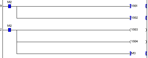 輸出Y000  Y003 Y004 在監視圖里沒有輸出 在PLC上有輸出指示燈,不過效果和點動的查不多一閃一閃的。這個問題出在那啊? 原來是M2直接驅動Y003 Y004的還是這個情況