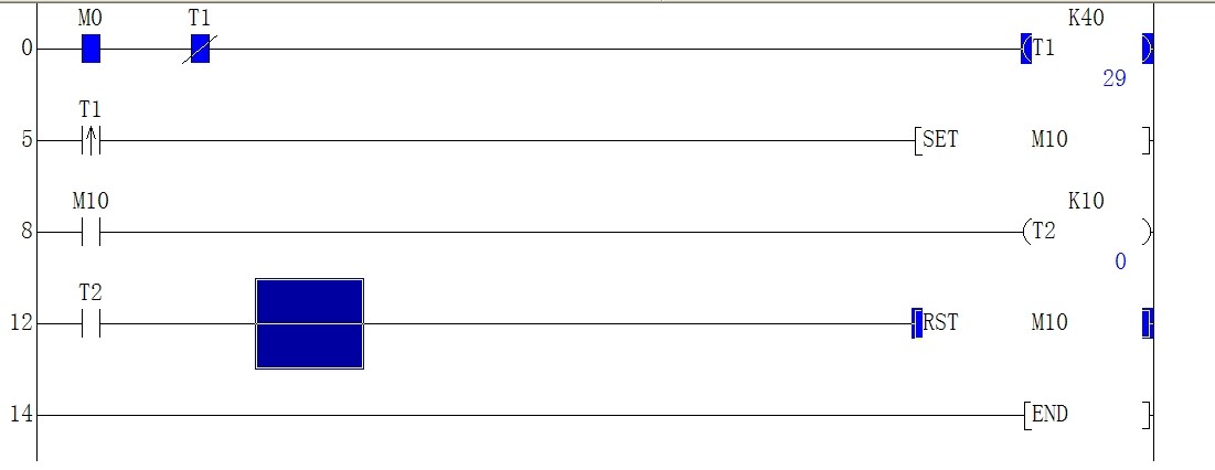 加一個輔助繼電器。t1驅動一個輔助繼電器,用這個繼電器的觸電代替程序中的T1觸點就可以了,