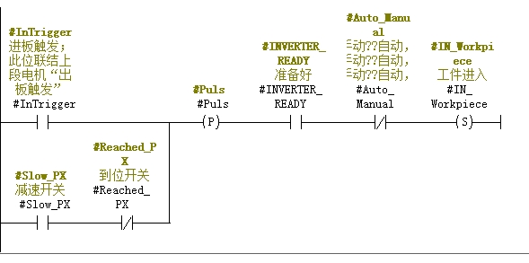大概意思是:當(dāng)操作模式開關(guān)在自動(dòng)狀態(tài),加上進(jìn)工件的條件都具備,這時(shí)只要以下兩個(gè)條件的其中任何一個(gè)接通一個(gè)瞬間就置位進(jìn)工件繼電器。這兩個(gè)條件分別是進(jìn)板觸發(fā)條件具備和沒到位的情況下減速開關(guān)接通一個(gè)脈沖。