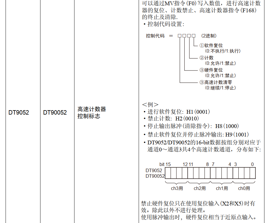 是停止CH0通道發脈沖指令 松下PLC DT90052是位置控制的系統控制區 好多動作時寫入不同的數據 達到要求的