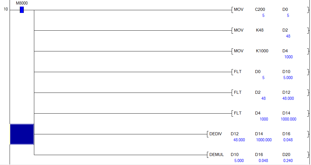 引用引用樓主劉偉哥于2020-03-29 19:38發(fā)表的 求助FX2N帶小數(shù)點的乘除法運算 :計數(shù)器C200的值乘以0.096(來自文本編輯器)再除以2,再通過文本編輯器顯示。哪位能幫忙解決一下。感激不盡!