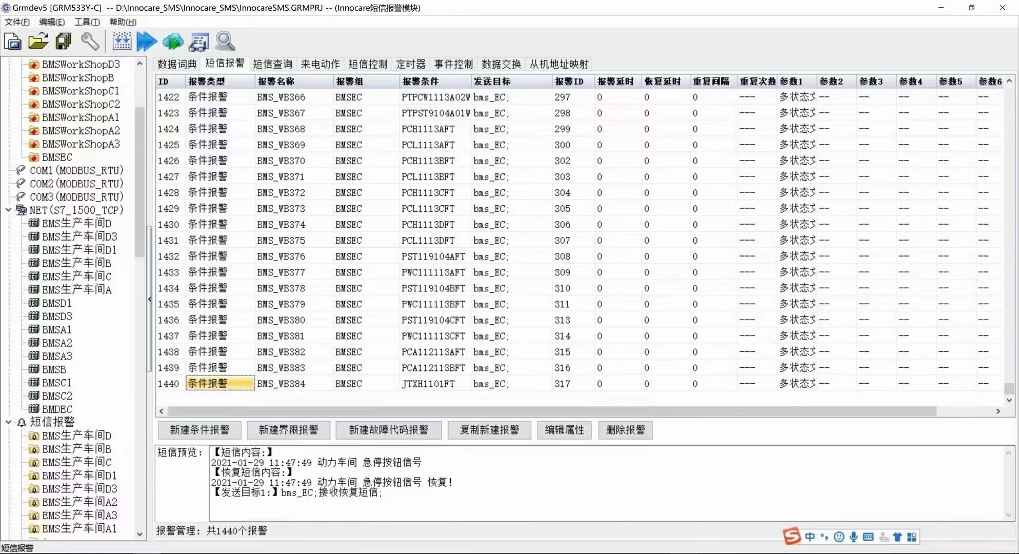 醫藥行業應用,一個遠程模塊連接15臺1500短信報警1400條,變量1477個。實現遠程上下載調試plc,hmi程序,手機APP遠程監控plc。