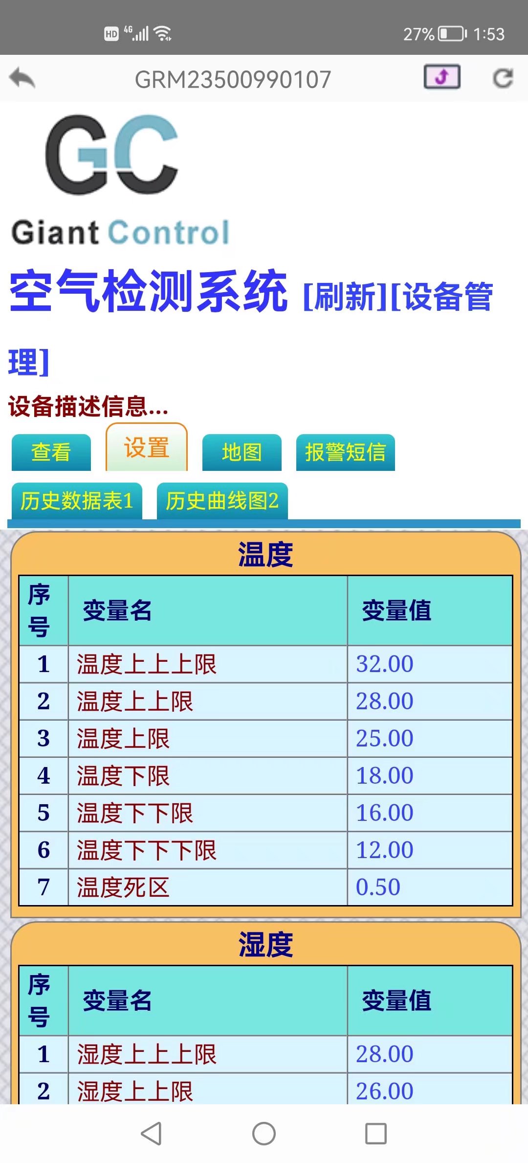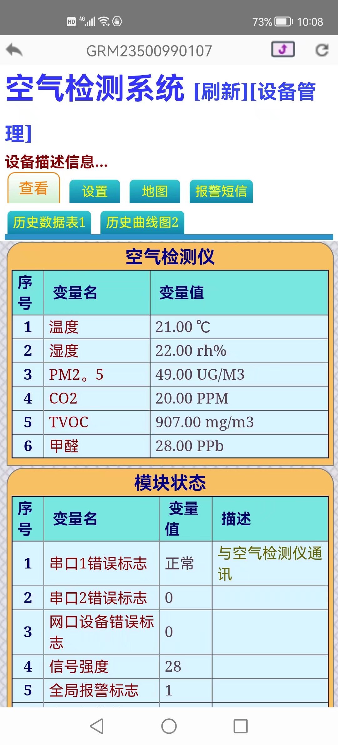 空氣檢測系統加裝遠程模塊,走485 modbus rtu協議進行通訊實現遠程手機APP監控,超標微信告警,數據記錄及曲線查詢