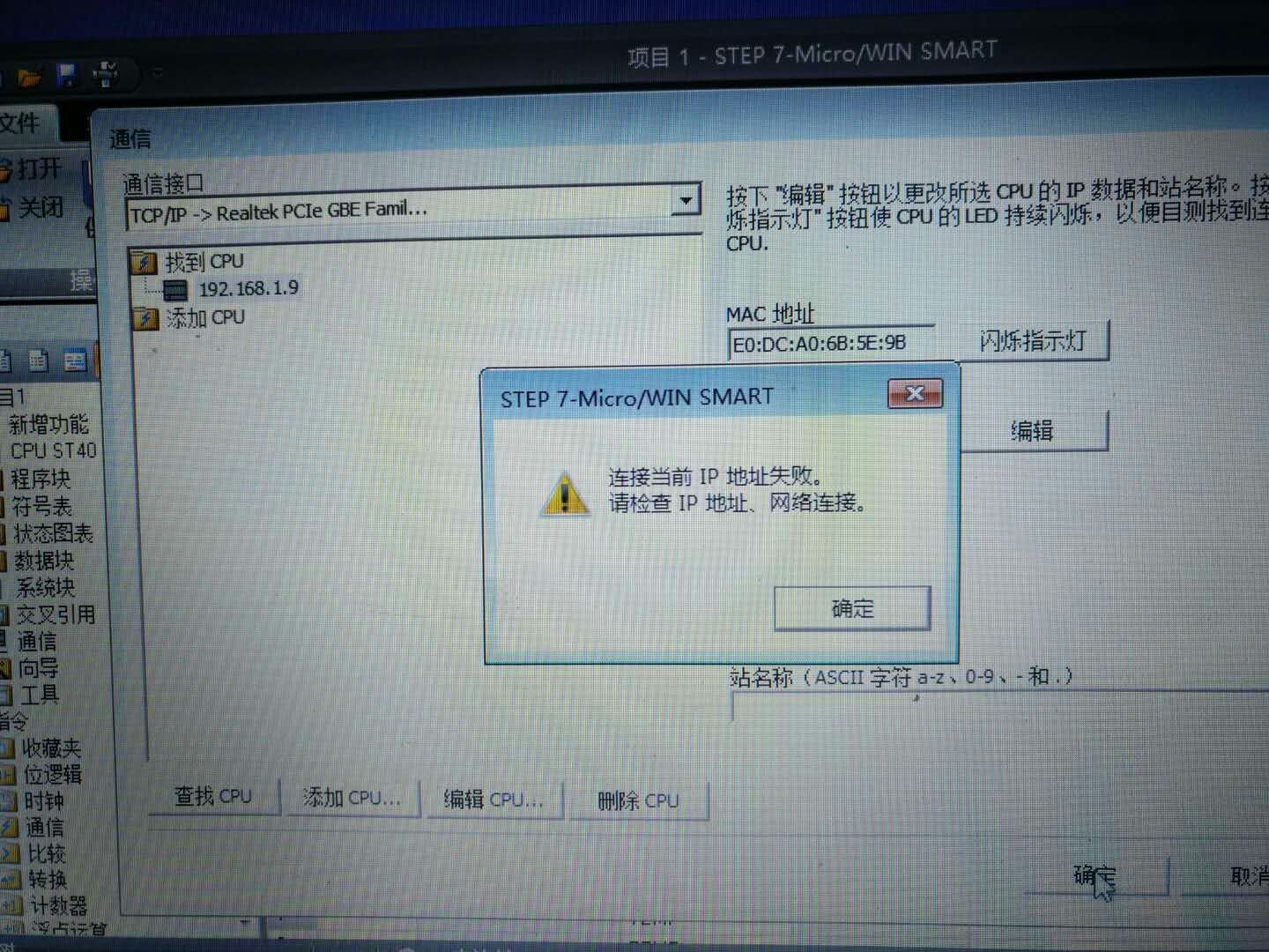 200smatr網口硬件連好,plc link燈點亮,編程軟件中查找到cpu ip地址192.168.1.9 點閃爍指示燈plc燈閃爍,ip地址 子網 默認網關都設置好了, 點擊“確認” 彈出“連接當前ip地址失敗。請檢查ip地址、網絡連接”。不知問題出在哪里?筆記本電腦。 請各位大俠幫忙指點一下,謝謝! |