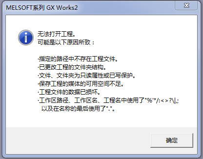 GX Works2無法打開工程如下圖,以前是可以打開的,昨天想打開以前的程序結果打不開,按論壇的辦法都不行,重新安裝 Works2的幾個版本也不行,電腦沒安裝什么電腦管家之類的,請問各位大俠有可以解決的方法嗎