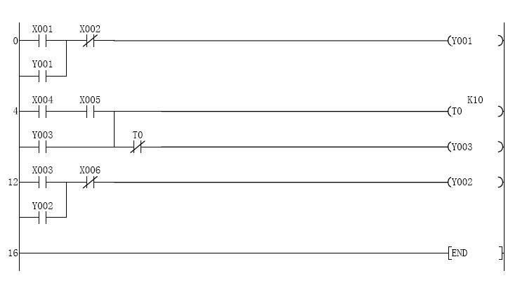 若X004與X005均接通后則氣缸Y003得電吸合并延時1秒后斷開,否則Y003不吸合