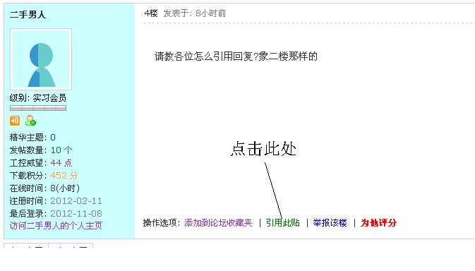 引用引用第4樓二手男人于2012-11-08 11:54發表的 :請教各位怎么引用回復?象二樓那樣的