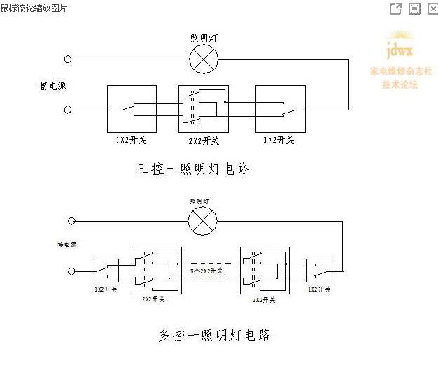 兩個開關(guān)控制一個日光燈,開關(guān)上面有三個接觸點【應該是“接線點”的吧】(現(xiàn)在很多家里都用這種開關(guān)),【樓主好像還有“很多”其他的“家”】我還沒有試過三個控制儀【一】【冷眼一瞅:三個控制儀!】個燈的接法。