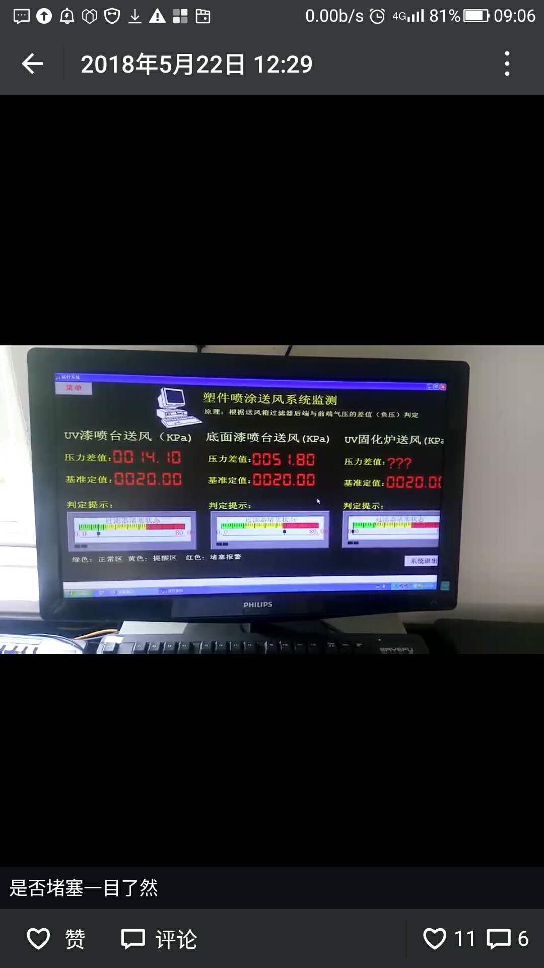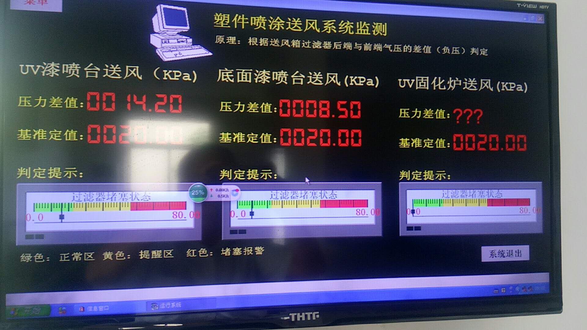 機械式壓差表也裝過,觀察很不方便(送風柜裝的很高,機械式如果想在地面讀取就得接5米左右的氣管,靈敏度會大幅下降),更要命的是有數值沒法直觀自動判定,車間為降低成本耗材能省則省,但噴臺送風效果不好又會嗷嗷叫,很扯皮。我現在做的是采用數字通信,遠距離讀取,會根據不同的設定值自動判定,同時現場整個大屏自己看著,用數據還原現實(亮點就是那排色標顯示區,紅色讓看到的都不爽)
