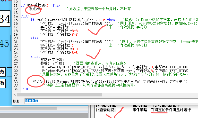 第四步,建立查表邏輯和數據處理。核心腳本如圖。我們首先對小于查表第一行的數據賦值0。之后判斷數據正常后,取原數據的整數部分進行判斷,例如96.3我們就查閱第96行起的8個有效字符。它的查詢起始地址偏移量就是96*8-8=760。當然要注意format函數有四舍五入的屬性,例如96.7取整就是97。所以查詢地址偏移量要做調整。最后思考表格分辨率的問題,剛才舉例的數據都不在表格的整行上,那我們就直接查出相鄰兩行數據,中間線性轉換一下就行。這樣就保證了數據的連續性。
