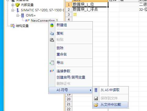 第三步,在WinCC的變量管理對應鏈接上右鍵,選擇AS符號,從文件中加載。