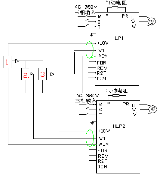 以第一臺為主,第二臺的給定接于第一臺的直流電壓輸出,調(diào)試時打一同步。這只是近似同步,如果要真正同步第二臺最好再加以傳感器進行pid調(diào)節(jié)。