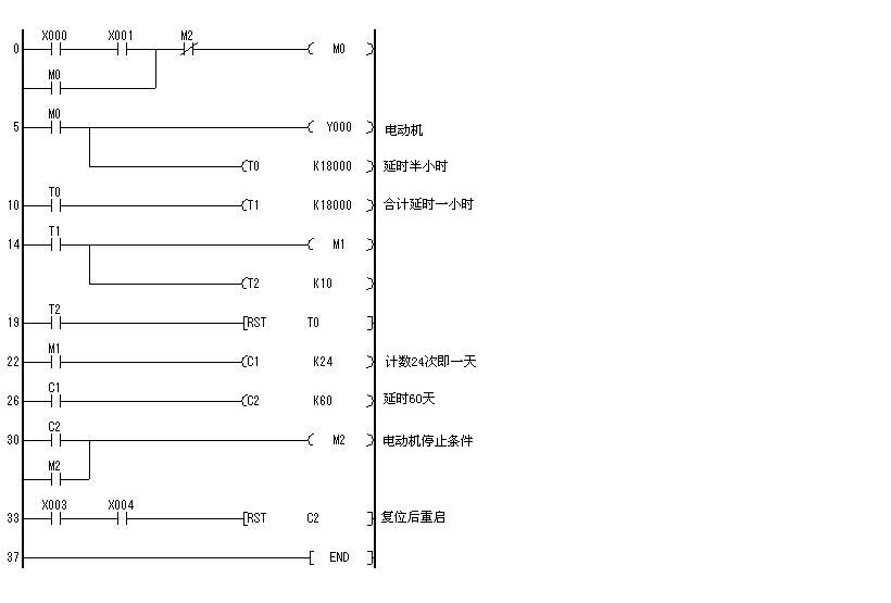 當同時按下啟動按鈕X0,X1時Y0動作,延時60天自動停止(因為電動機工作環境惡劣所以需要維護)