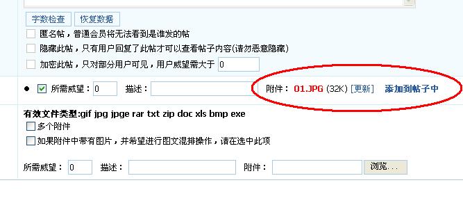 5.將“附件”--“添加到帖子中”按照自己需要進行編輯,插入帖子內容;